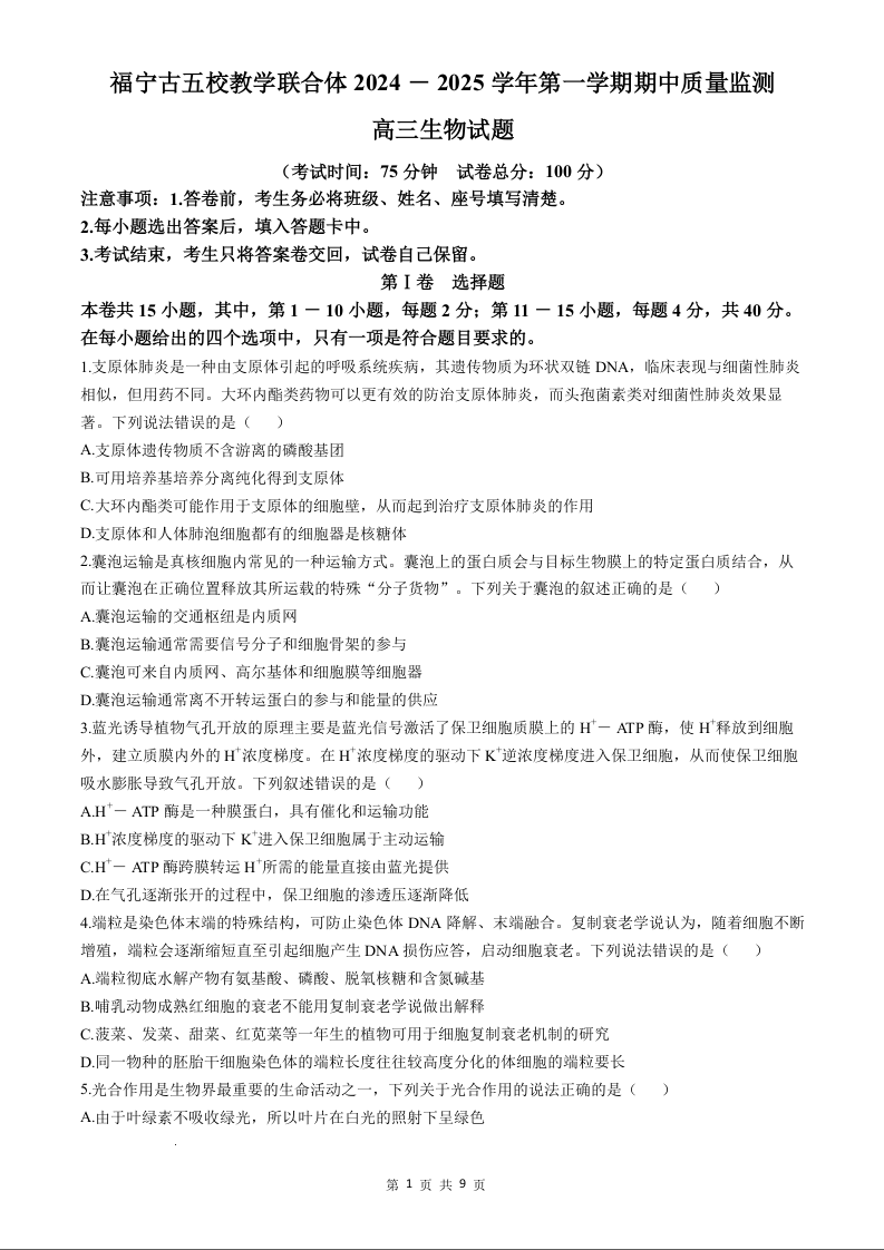 福建省宁德市福宁古五校教学联合体2025届高三上学期期中联考生物试题+答案