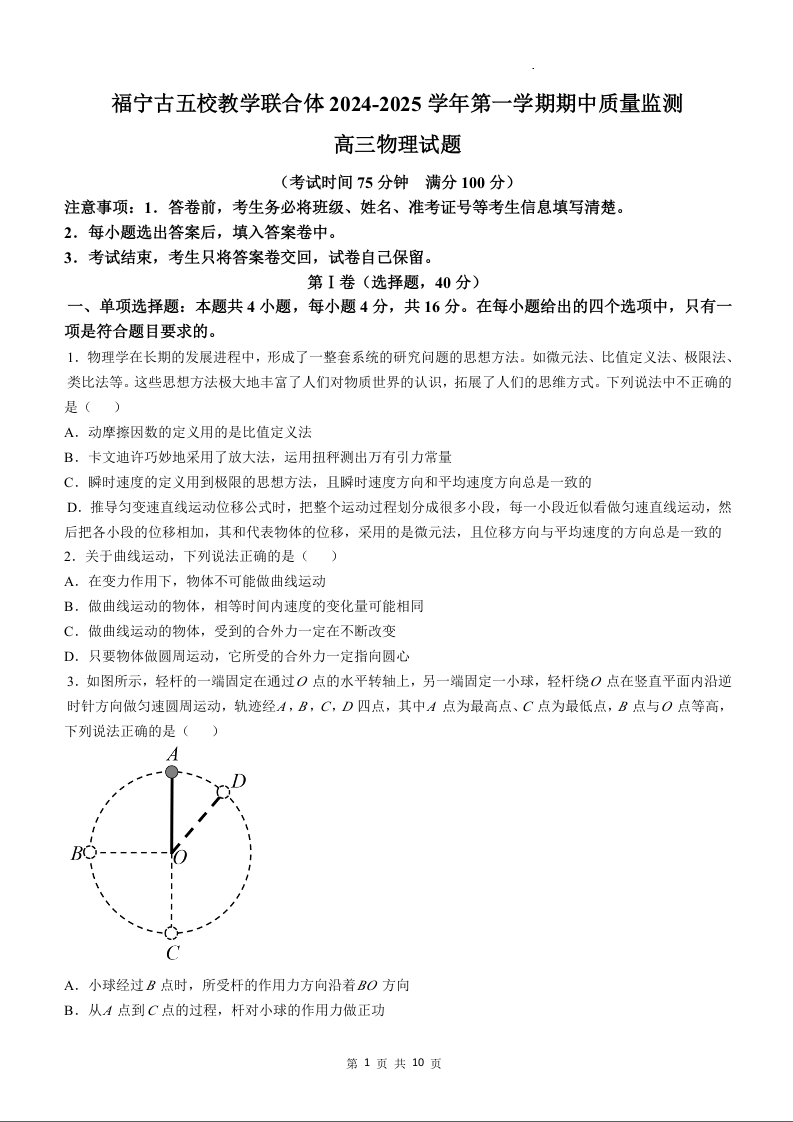 福建省宁德市福宁古五校教学联合体2025届高三上学期期中联考物理试题+答案