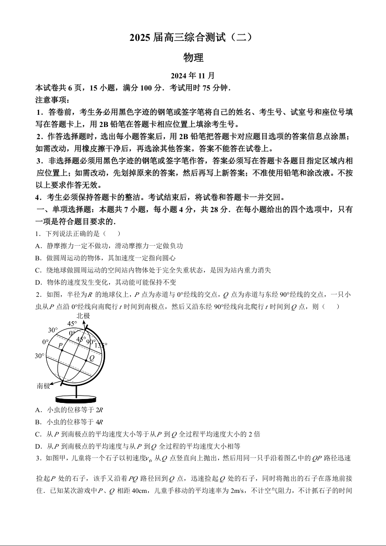 广东省华南师范大学附属中学2024-2025学年高三上学期11月综合测试(二)物理 Word版含答案