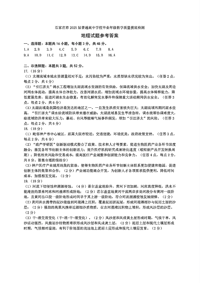 河北省石家庄市2025届高三上学期教学质量摸底检测地理答案
