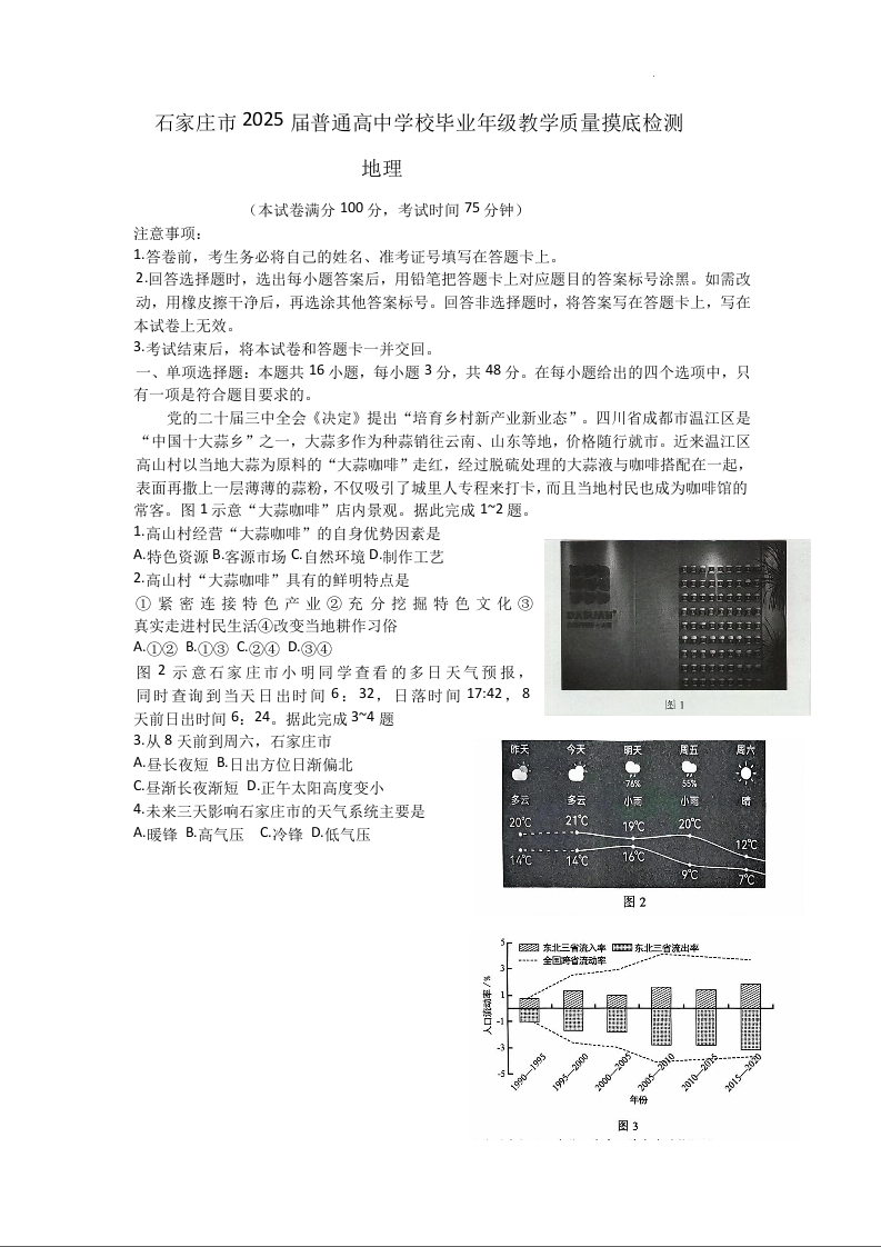 河北省石家庄市2025届高三上学期教学质量摸底检测地理试题