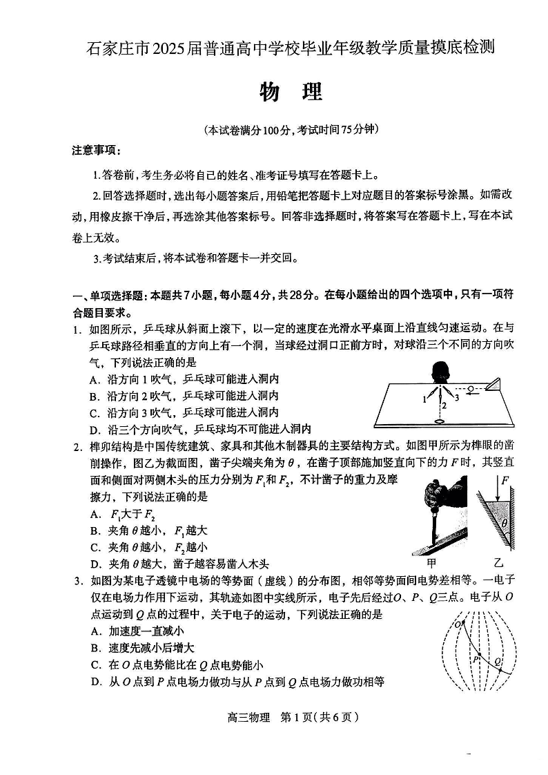 河北省石家庄市2025届高三上学期教学质量摸底检测物理试题
