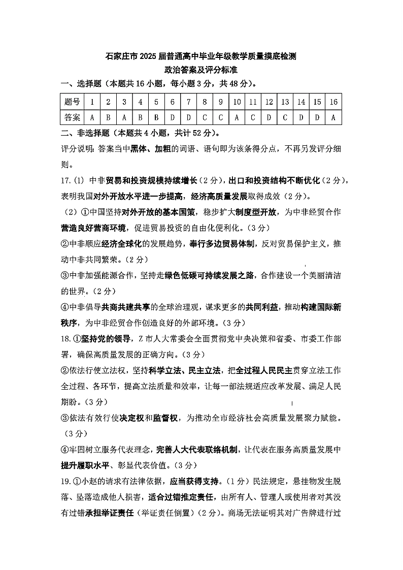 河北省石家庄市2025届高三上学期教学质量摸底检测政治答案