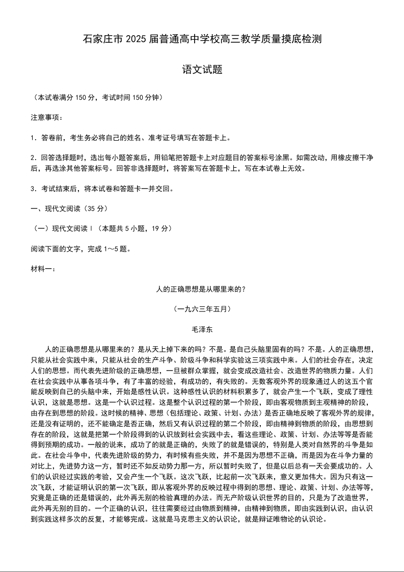 河北省石家庄市2025届高三上学期教学质量摸底检测语文试卷+答案