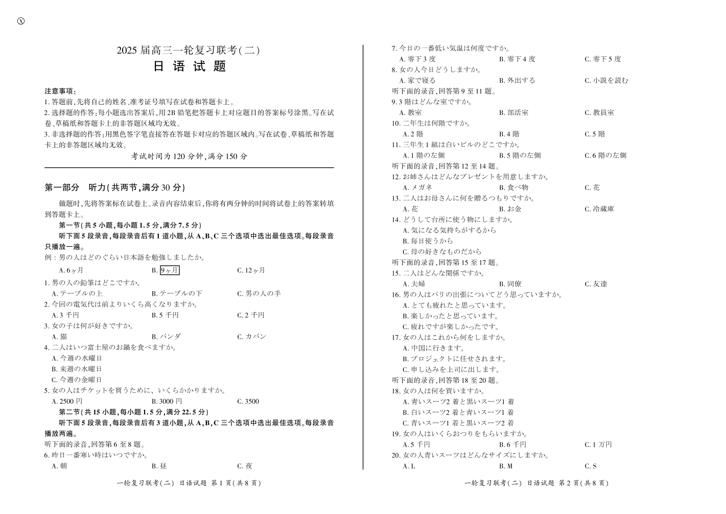 百师联盟2025届高三一轮复习联考(二)(云贵川)日语