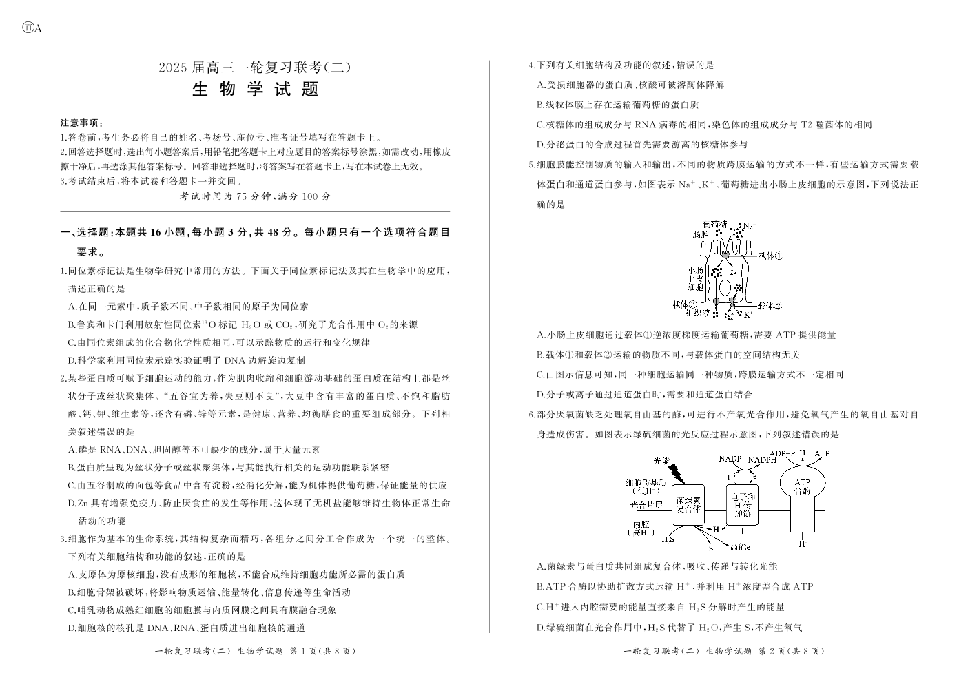 百师联盟2025届高三一轮复习联考(二)(云贵川)生物