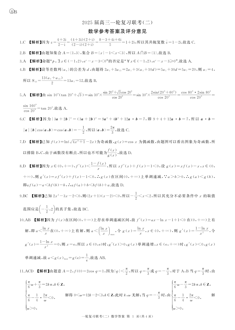 百师联盟2025届高三一轮复习联考(二)(云贵川)数学答案