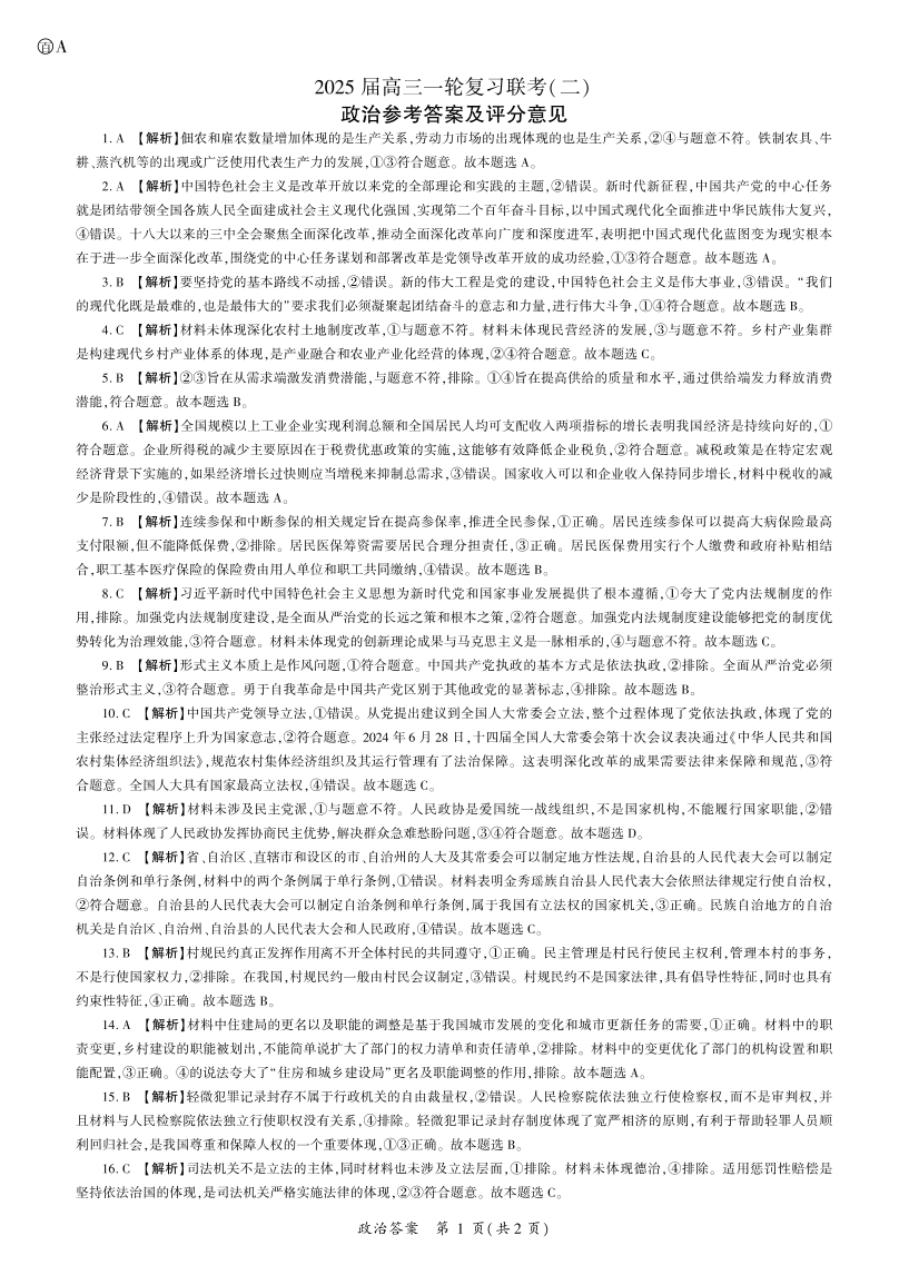 百师联盟2025届高三一轮复习联考(二)(云贵川)政治答案