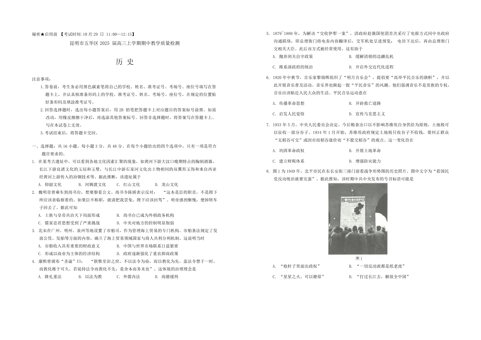 昆明市五华区2025届高三上学期期中教学质量检测历史试卷