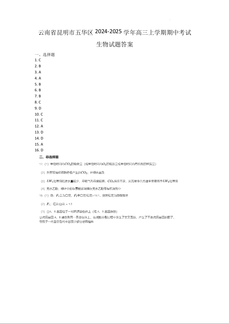 昆明市五华区2025届高三上学期期中教学质量检测生物试题答案