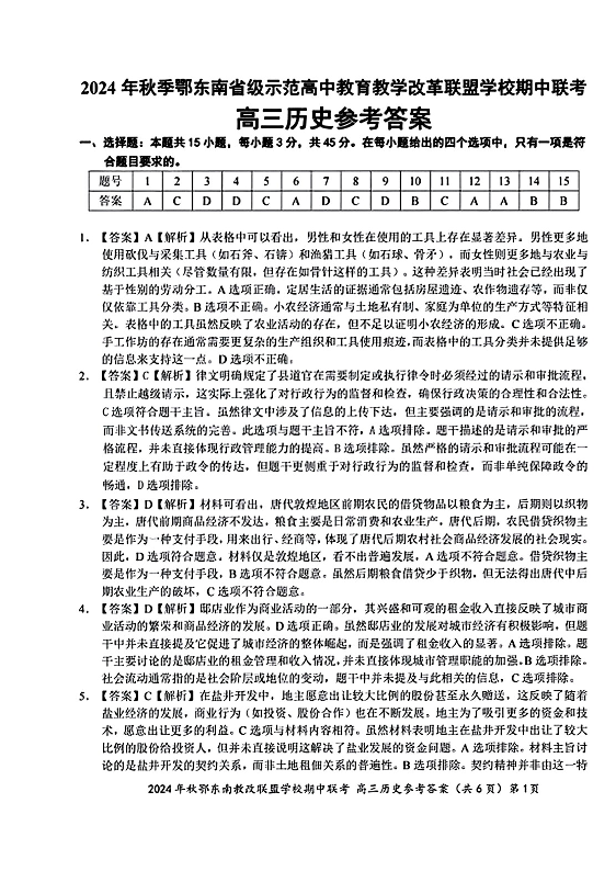 2025届湖北省鄂东南示范高中高三11月期中联考历史答案