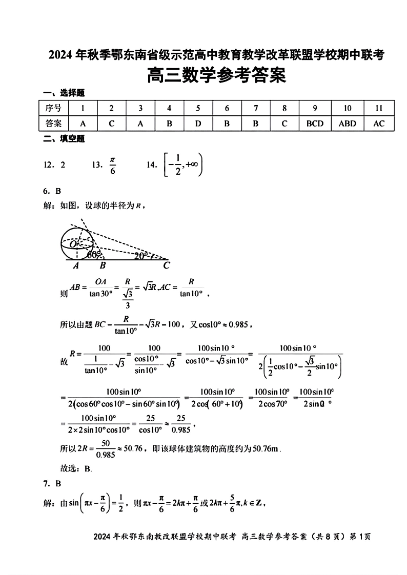 2025届湖北省鄂东南示范高中高三11月期中联考数学答案
