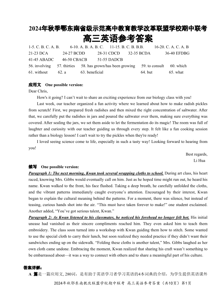 2025届湖北省鄂东南示范高中高三11月期中联考英语答案