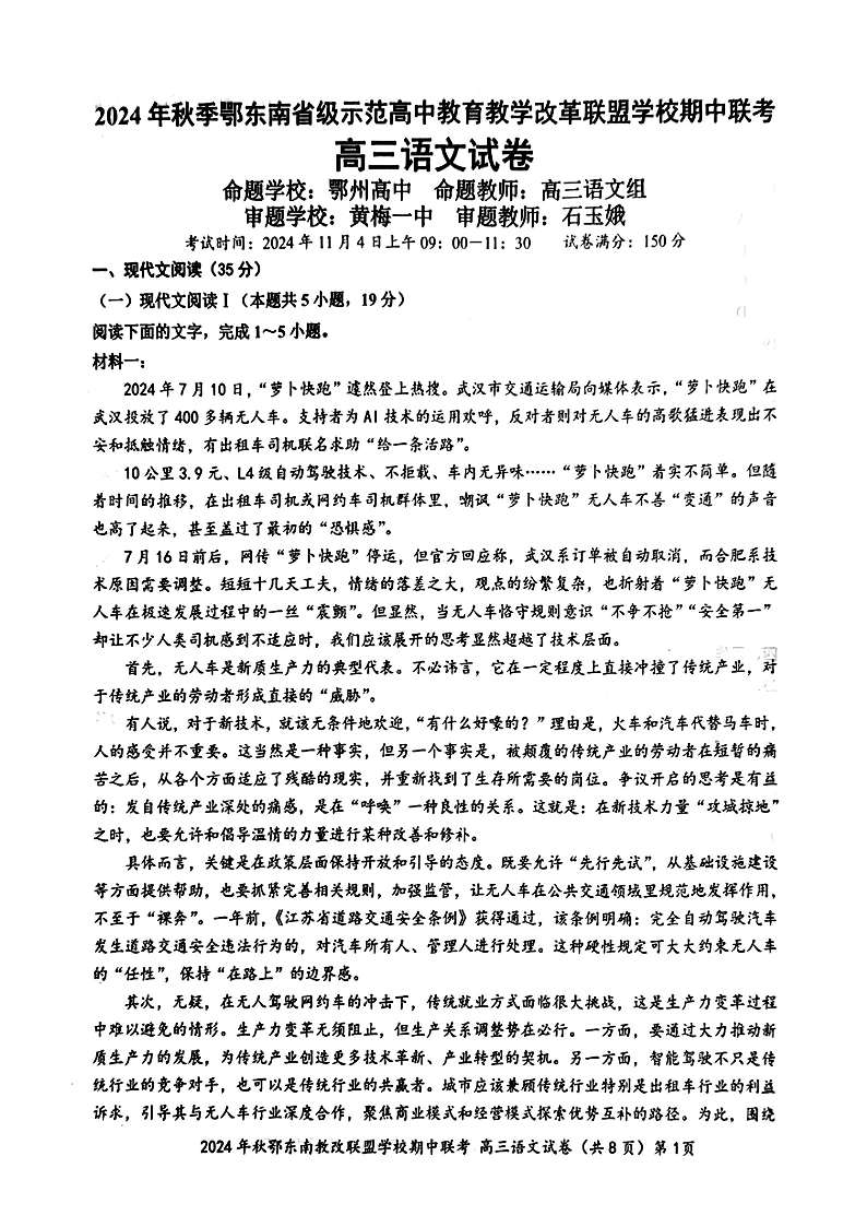 2025届湖北省鄂东南示范高中高三11月期中联考语文试卷