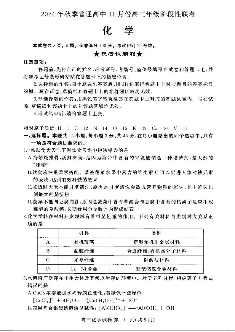 2025届湖北省鄂东协作体秋季普通高中11月份高三阶段性联考化学试卷