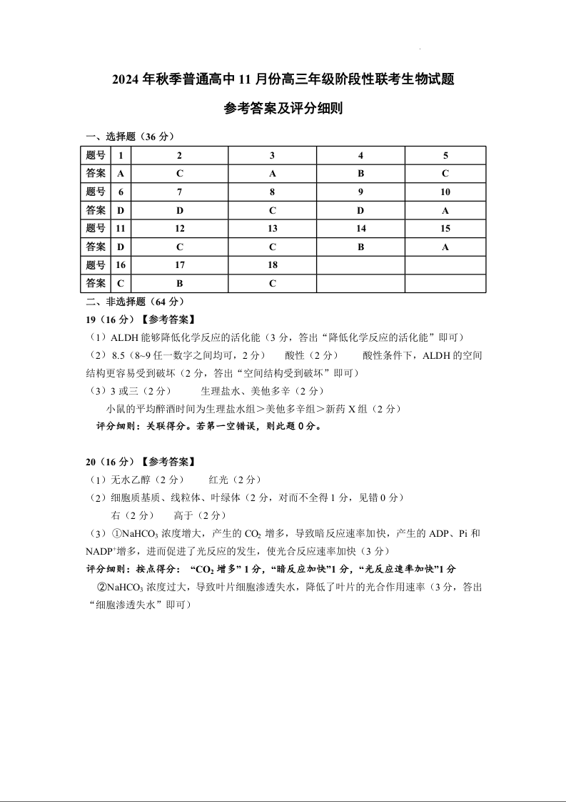 2025届湖北省鄂东协作体秋季普通高中11月份高三阶段性联考生物答案