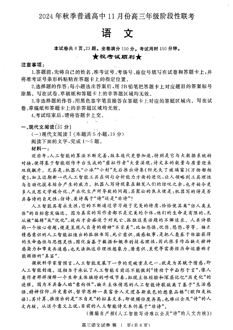 2025届湖北省鄂东协作体秋季普通高中11月份高三阶段性联考语文试卷