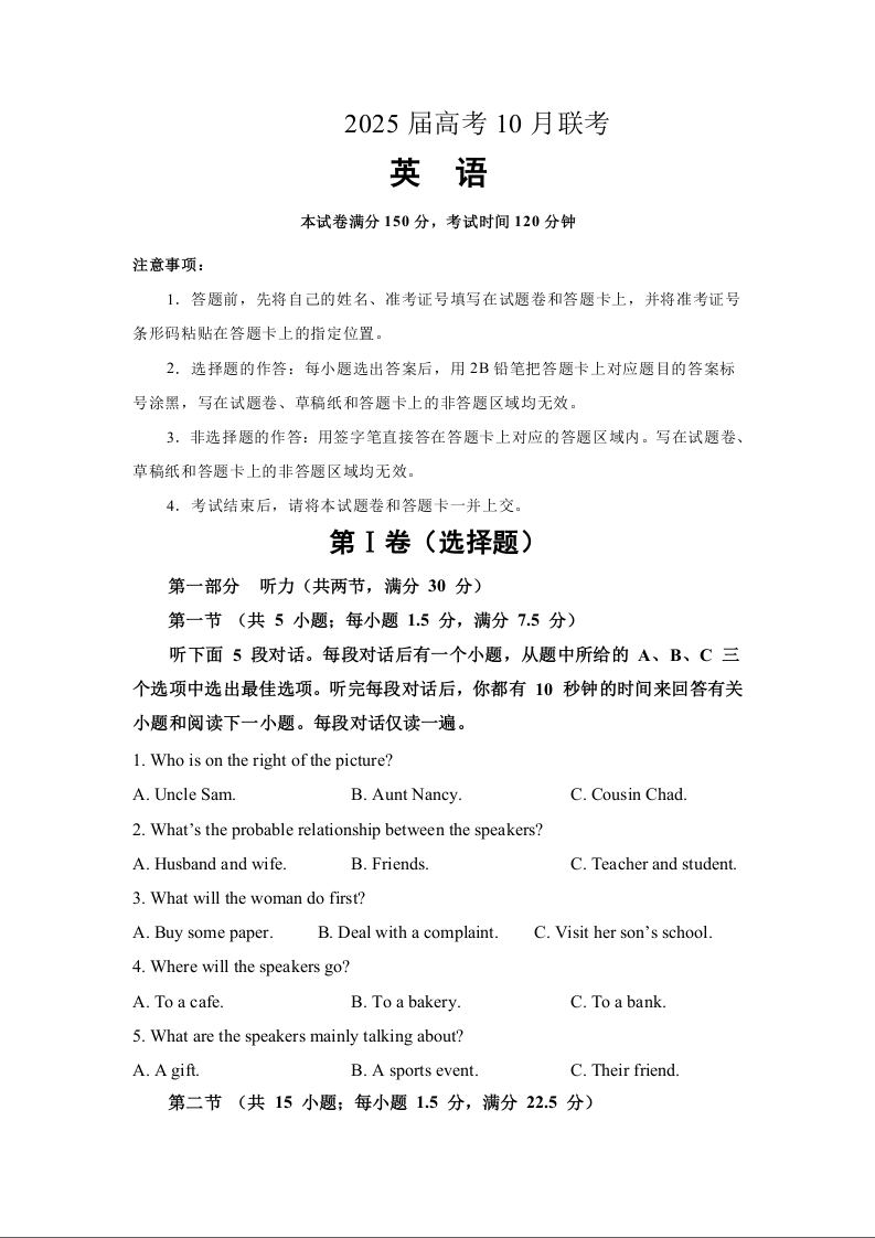 湖南省名校联考2024-2025学年高三上学期10月联考英语