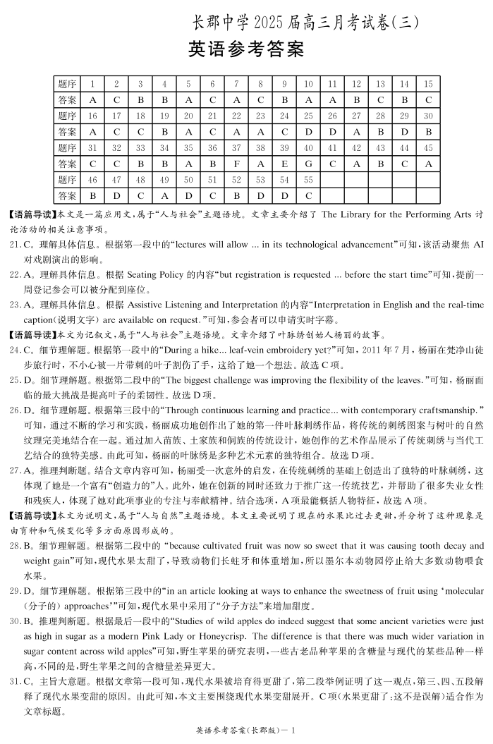 湖南省长沙市长郡中学2024-2025学年高三上学期第三次月考英语答案