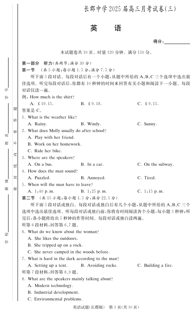 湖南省长沙市长郡中学2024-2025学年高三上学期第三次月考英语试卷