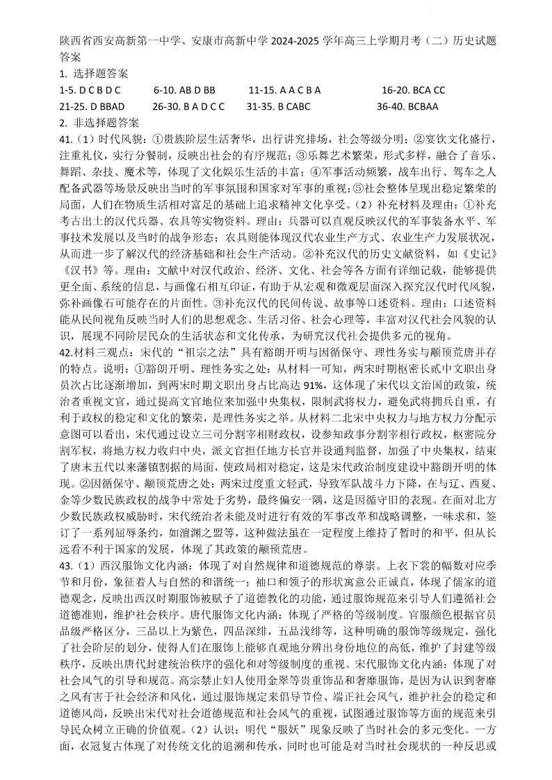 陕西省西安市2025届高三上学期11月联考一模(高新第一中学、安康市高新中学、宝鸡中学)历史答案