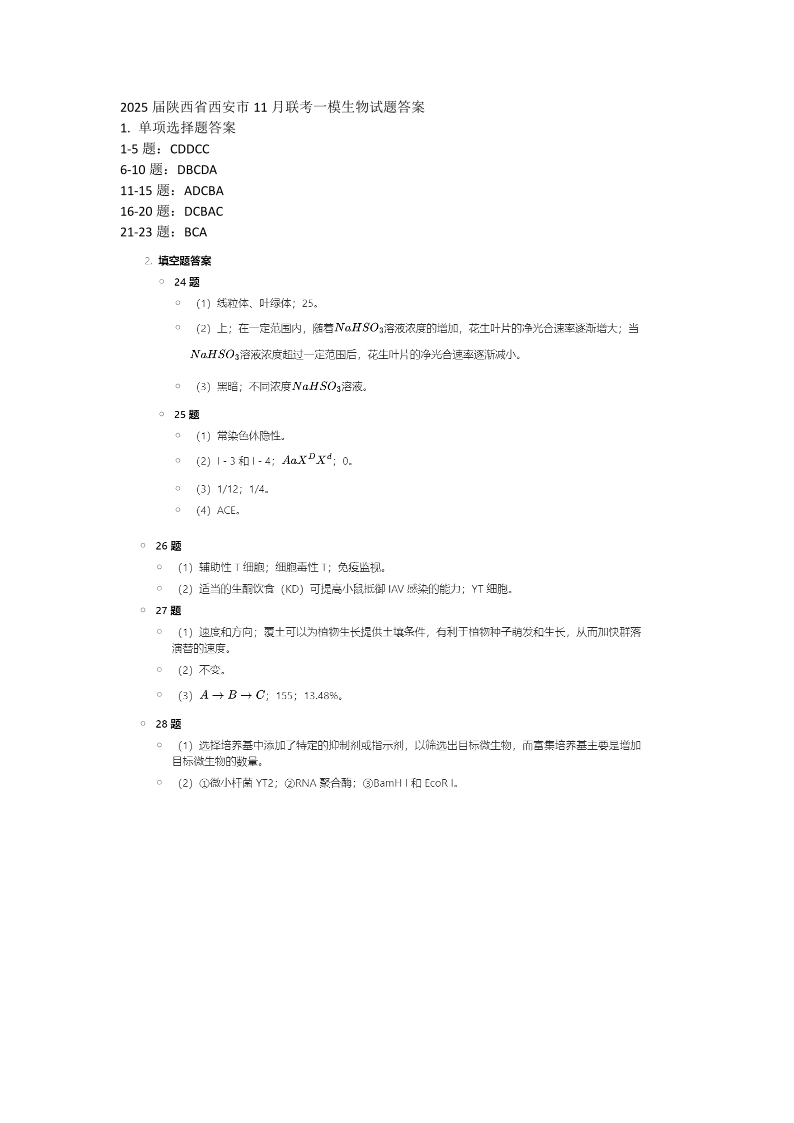 陕西省西安市2025届高三上学期11月联考一模(高新第一中学、安康市高新中学、宝鸡中学)生物答案