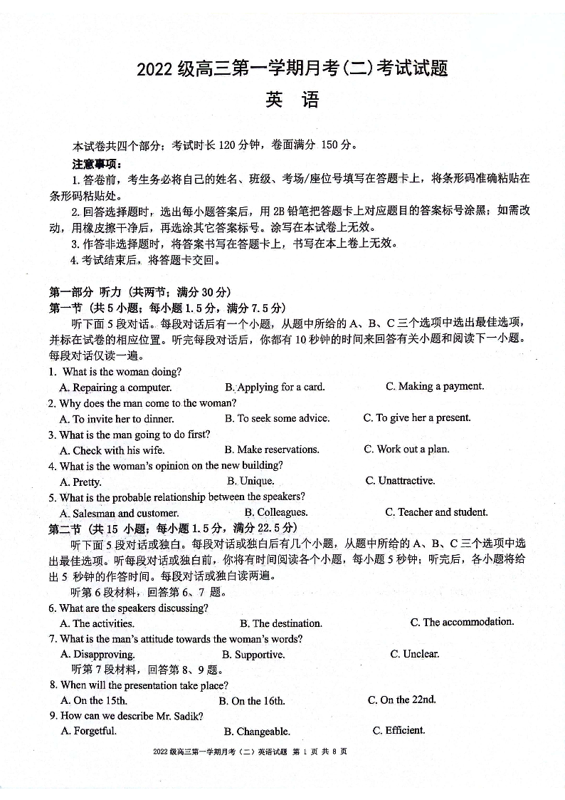 陕西省西安市2025届高三上学期11月联考一模(高新第一中学、安康市高新中学、宝鸡中学)英语试题