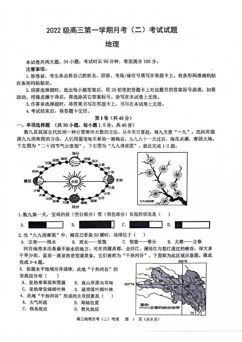 陕西省西安市2025届高三上学期11月联考一模(高新第一中学、安康市高新中学、宝鸡中学)地理及参考答案