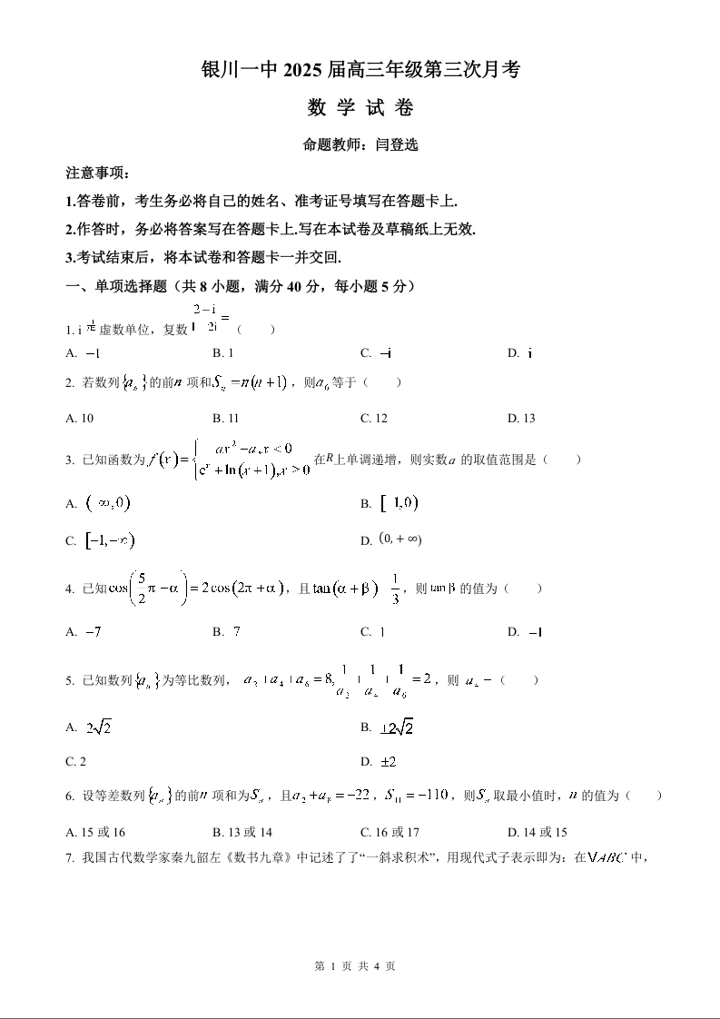 宁夏回族自治区银川一中2025届高三上学期第三次月考数学试卷
