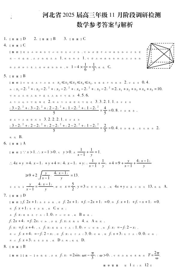 河北省2025届高三年级11月阶段调研检测数学参考答案