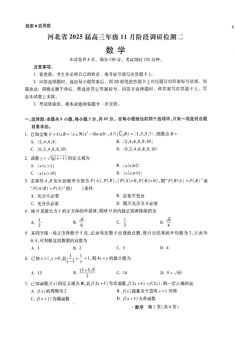 河北省2025届高三年级11月阶段调研检测数学试题