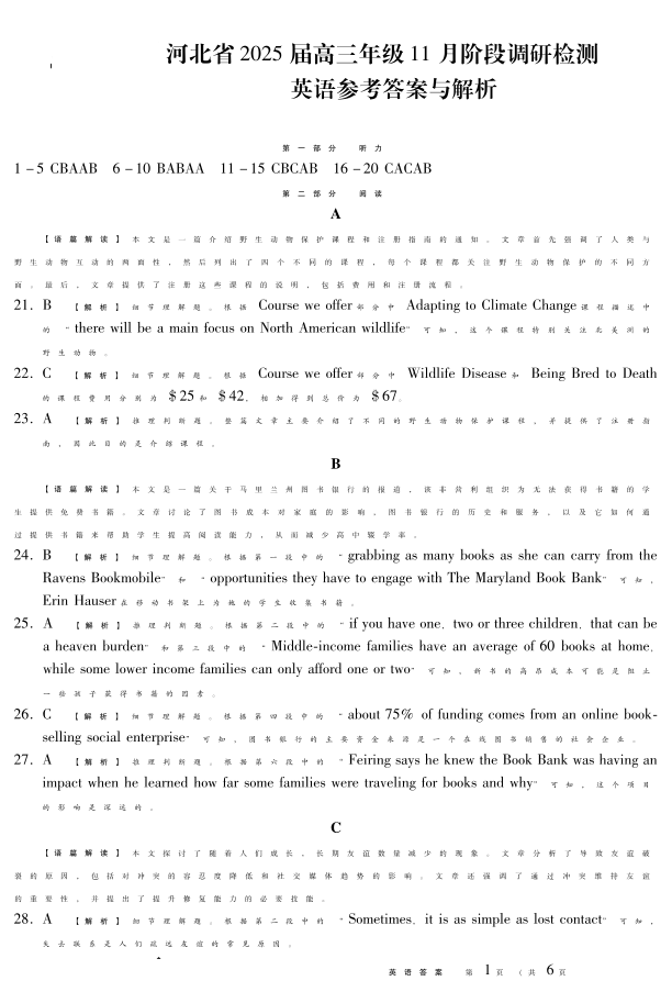 河北省2025届高三年级11月阶段调研检测(英语)答案