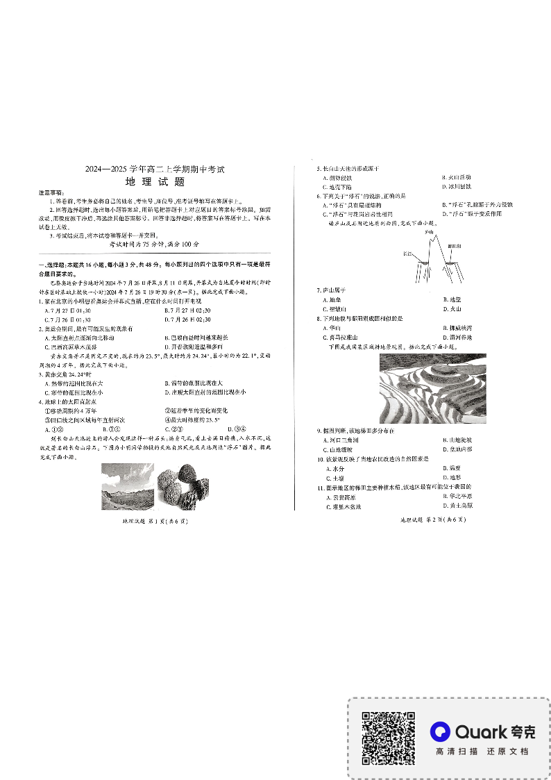 高二上学期11月期中考试地理试题
