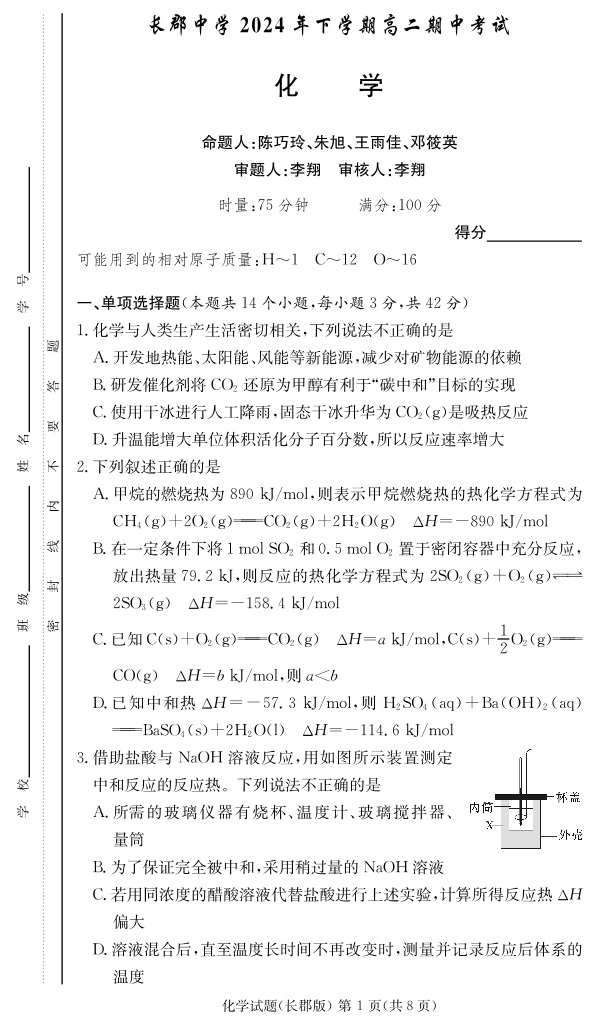 湖南省长沙市长郡中学2024-2025学年高二上学期11月期中考试化学试卷
