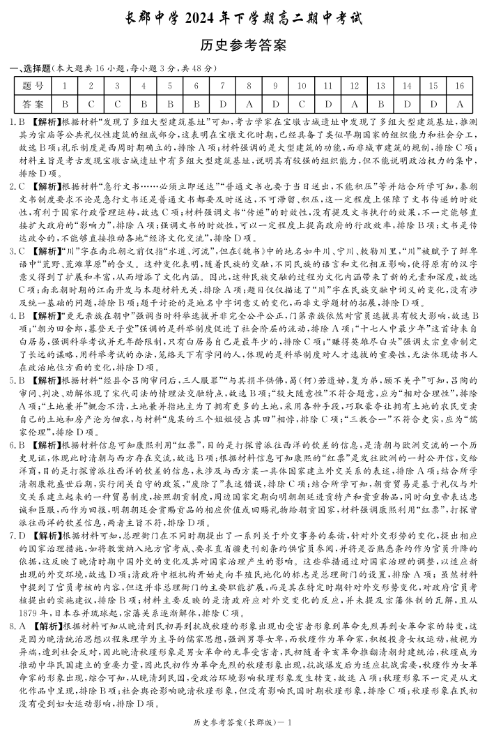 湖南省长沙市长郡中学2024-2025学年高二上学期11月期中考试历史答案