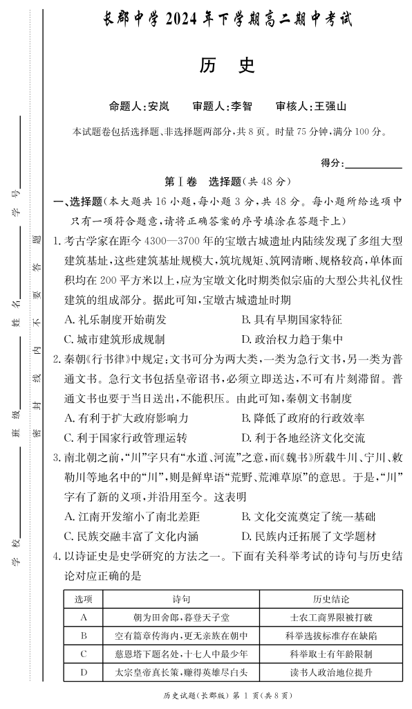 湖南省长沙市长郡中学2024-2025学年高二上学期11月期中考试历史试卷