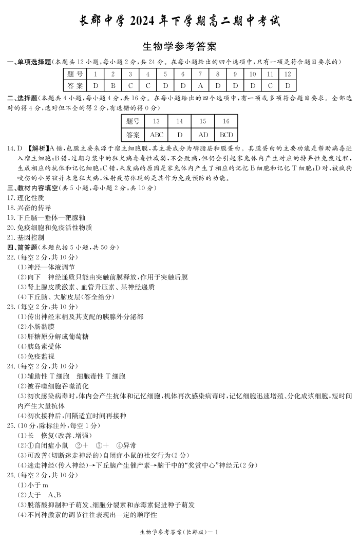 湖南省长沙市长郡中学2024-2025学年高二上学期11月期中考试生物答案