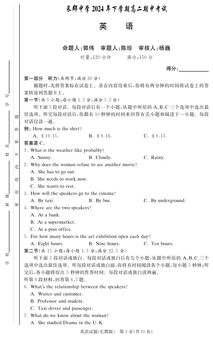 湖南省长沙市长郡中学2024-2025学年高二上学期11月期中考试英语试题