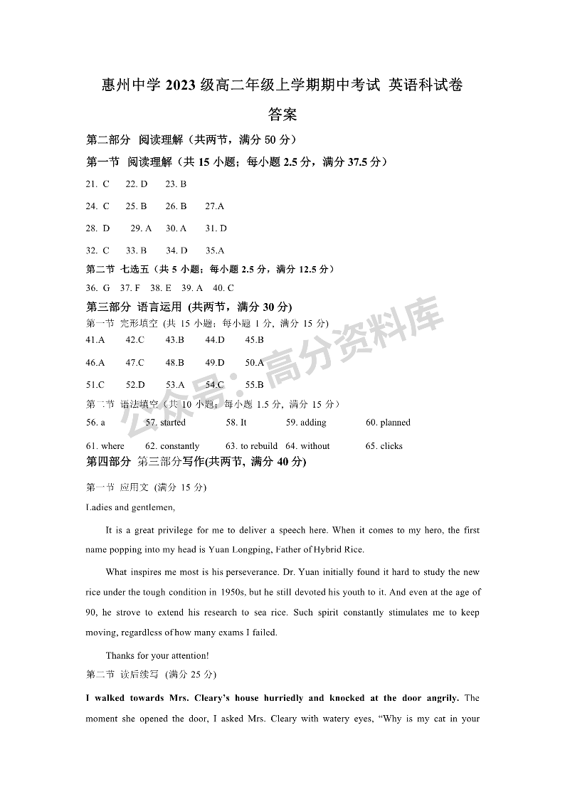 惠州中学2024-2025上学期高二11月期中考试英语科答案