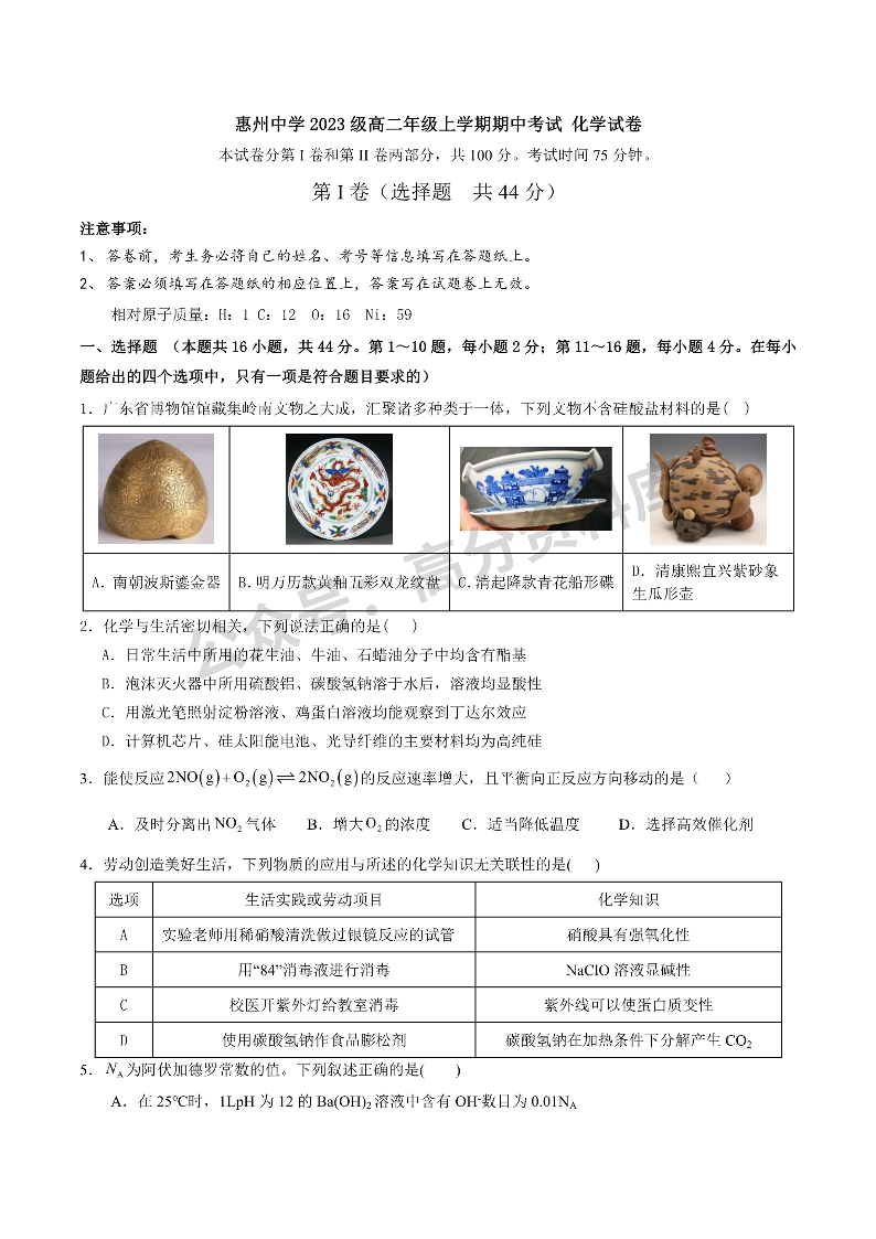 惠州中学2024-2025上学期高二11月期中考试化学试卷