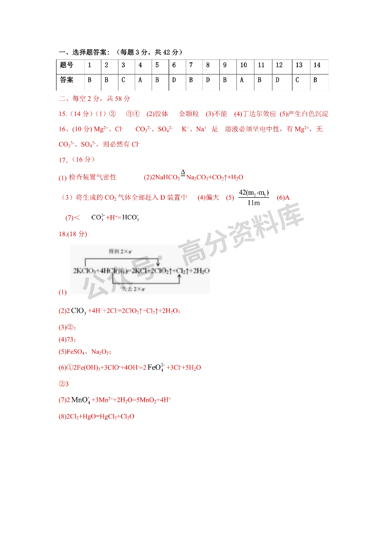 安徽省芜湖市第一中学2024-2025学年高一上学期中考试化学试题答案