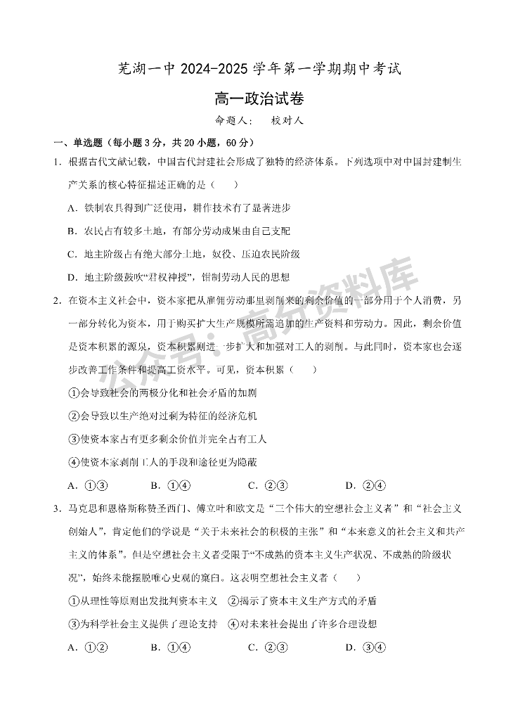 安徽省芜湖市第一中学2024-2025学年高一上学期中考试政治试题