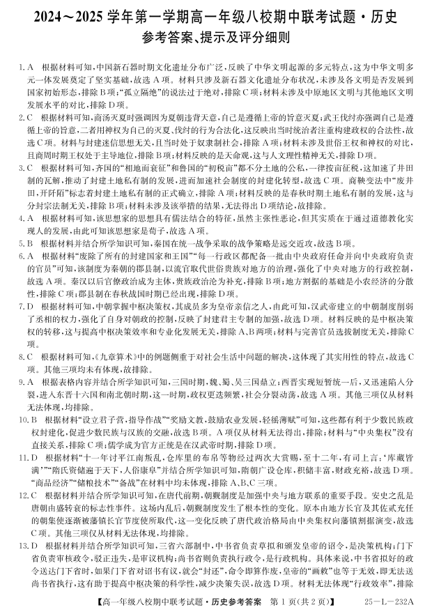 陕西省榆林市八校2024-2025学年高一上学期11月期中联考历史参考答案