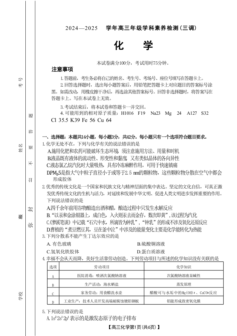 河北省衡水市桃城区2025届高三上学期10月学科素养监测(三调)化学试题及答案