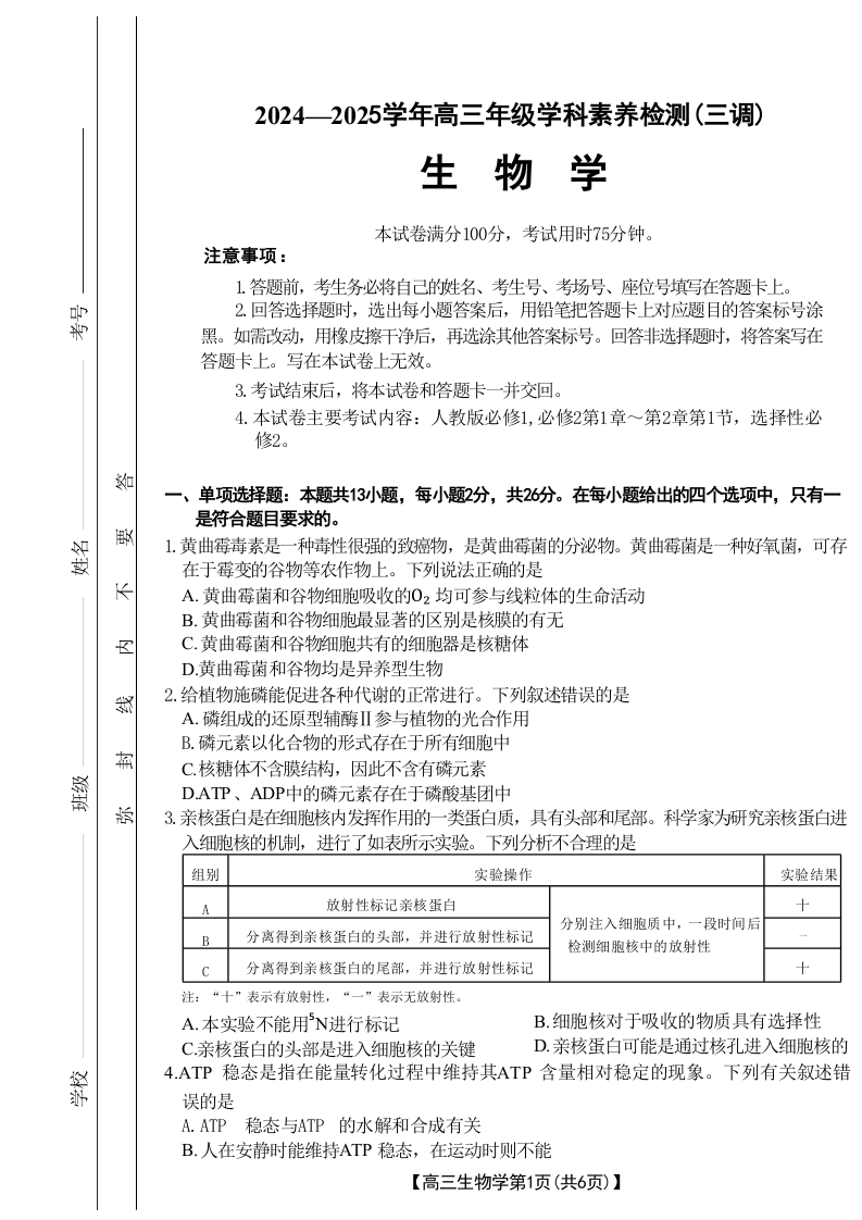 河北省衡水市桃城区2025届高三上学期10月学科素养监测(三调)生物试题及答案