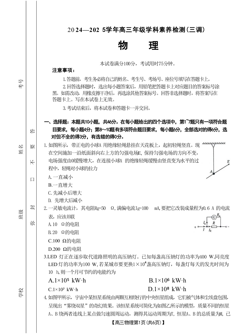 河北省衡水市桃城区2025届高三上学期10月学科素养监测(三调)物理试题及答案