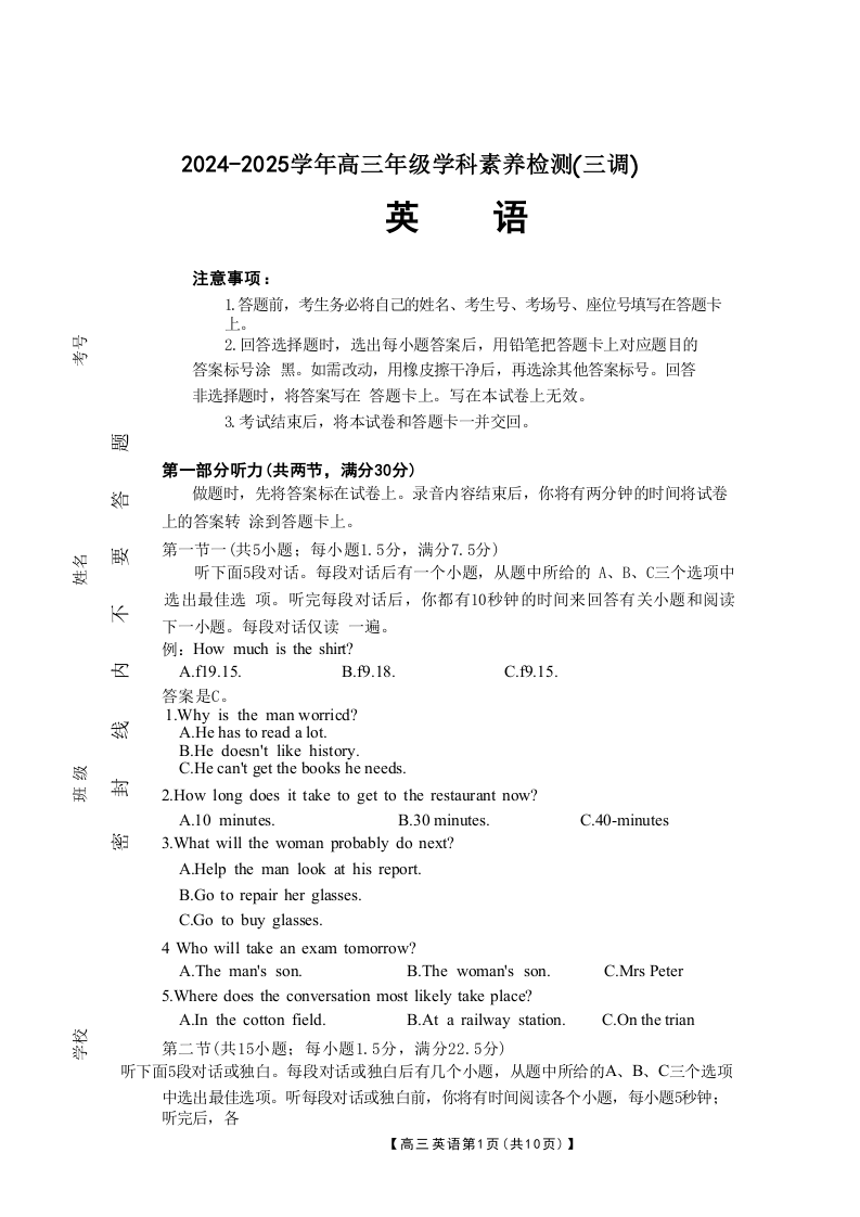 河北省衡水市桃城区2025届高三上学期10月学科素养监测(三调)英语试题及答案