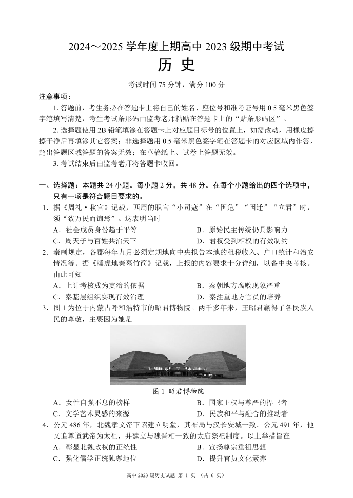 2024~2025学年度上期高中2023级期中考试历史试题