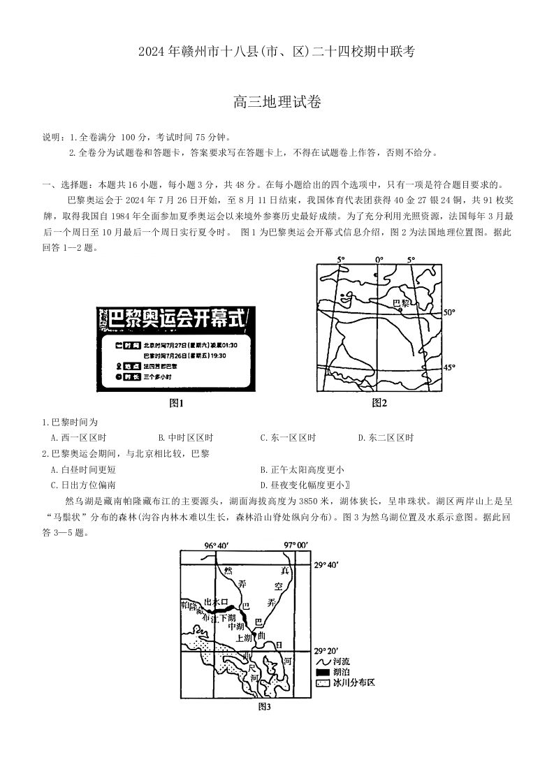 江西省赣州市十八县(市、区)二十四校2025届高三上学期期中考试地理试题