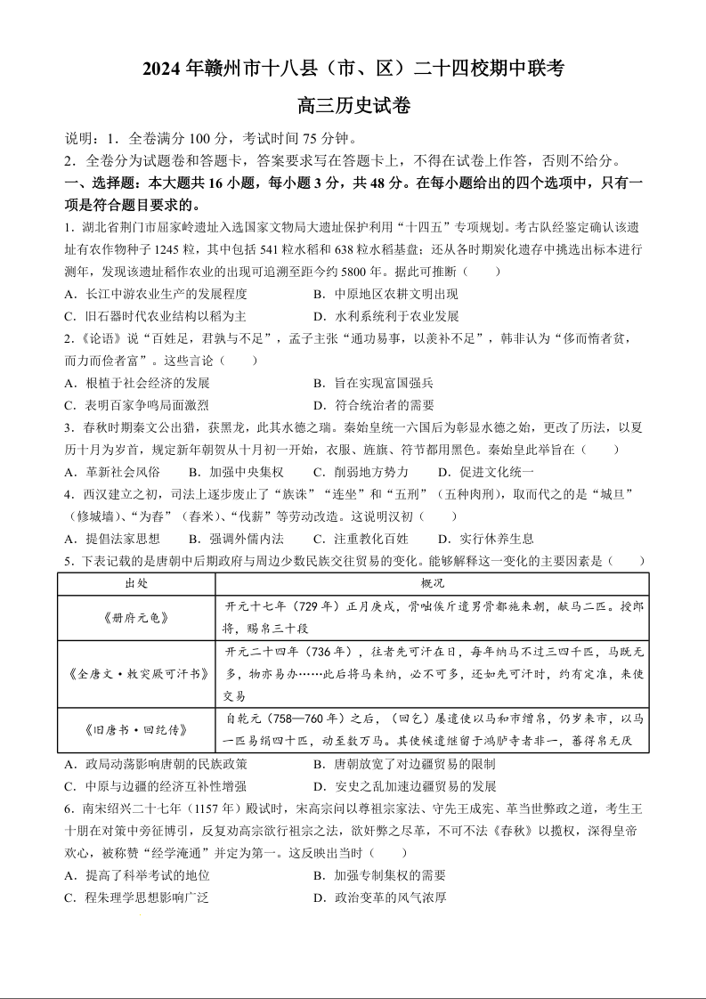 江西省赣州市十八县(市、区)二十四校2025届高三上学期期中考试历史试题及参考答案